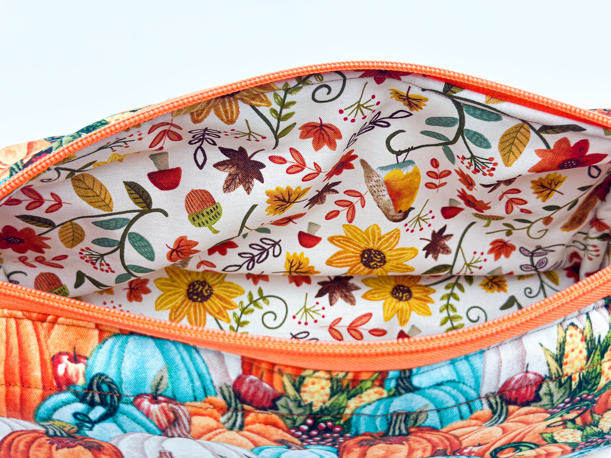 - L Colorful Pumpkins fabric Makeup Bag w/ floral and squirrel interior